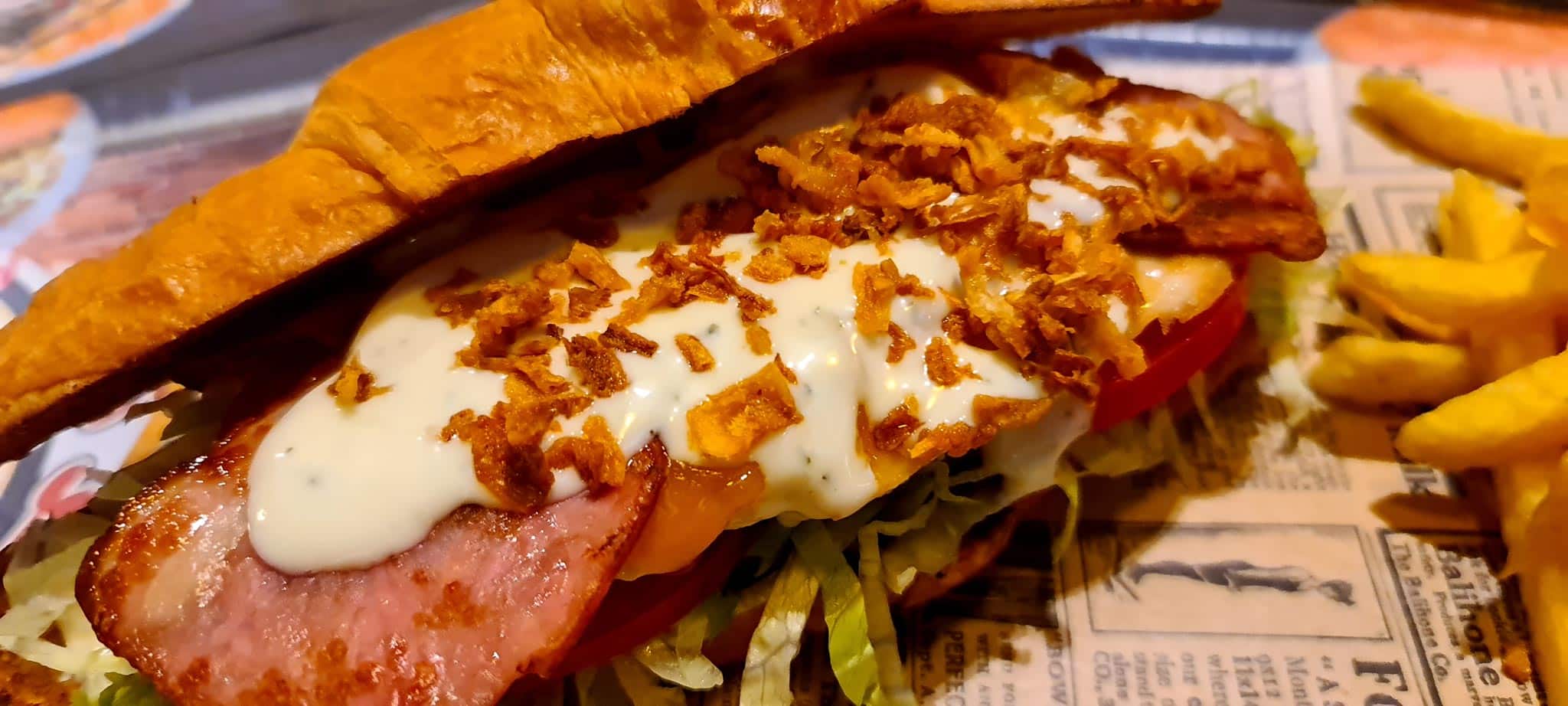 Pollo, brotes tiernos, tomate, bacon, cebolla frita y salsa césar